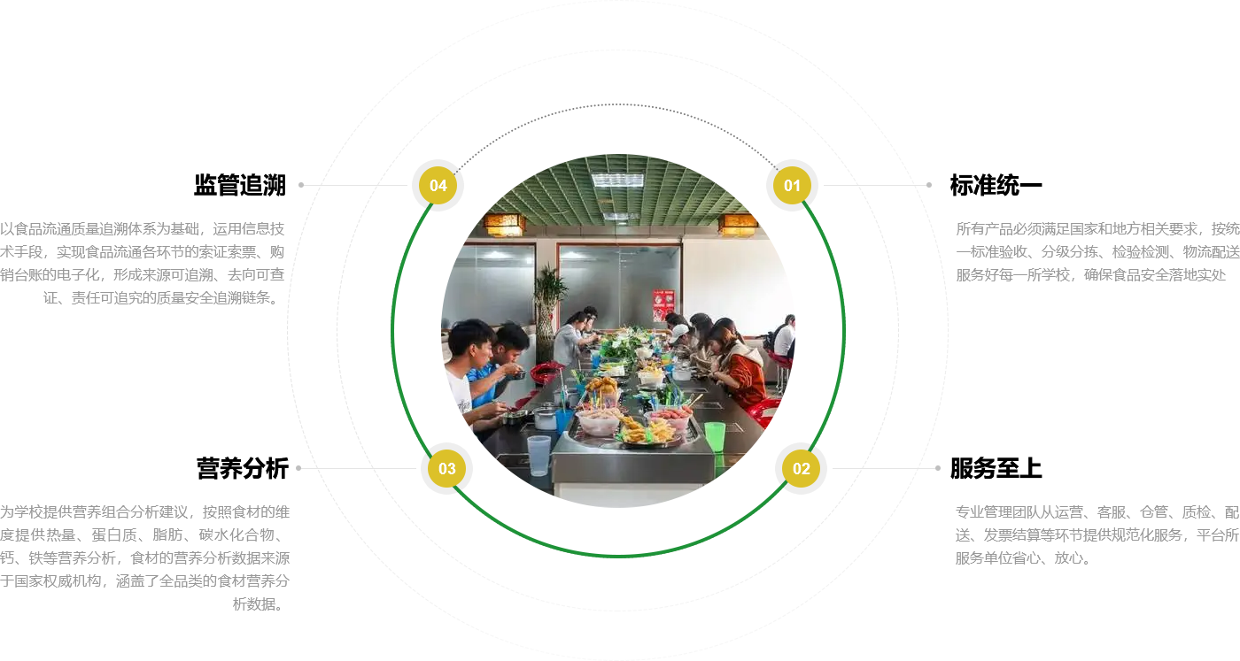 AYX愛游戲校園營養(yǎng)餐聚焦中小學,著眼公共食堂食品安全,依托標準的運營與嚴格的管理,以數字化食安監(jiān)管平臺為核心,確保食材供應實現全溯源、全檢測, 保障食品安全,用心關愛學生每一餐。